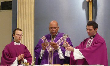 The Gospel:  The Liturgy of the Word is completed by the reading of the Gospel.  Before its reading, the members of the assembly trace the sign of the cross upon the forehead to indicate their mental acceptance of the Truth, on the lips to indicate their readiness to announce it, and over the heart to indicate their sincere desire to accept it into their lives.  The "Good News" of the Gospel tells that God's kingdom has come for all to hear, accept, and announce to the world for its salvation.  It is God who is speaking to us.  Christ comes to teach us by the example of His life and by His own words.