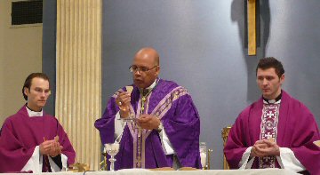 Priest:   Cleanse my heart and my lips, almighty God, that I may worthily proclaim your holy Gospel.      Through the words of the Gospel may our sins be wiped away.