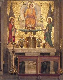 The Priest Approaches and Kisses the Altar: The altar is a symbol of Christ. In it are cut five crosses to recall the five wounds of Christ. The altar also represents the Church and has embedded in it the relics of her saints. The priest comes to the altar to celebrate the Sacrifice in the Church's name. Because of the glory surrounding the altar upon which the divine Sacrifice will be made, the kiss of the priest unites the Church to Christ, its Redeemer.